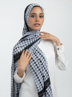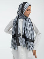 The Adele Scarf is a sophisticated and elegant accessory made from high-quality chiffon. This scarf features a timeless houndstooth pattern in a blend of black and white, adding a touch of classic elegance to any outfit.