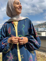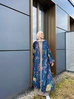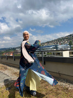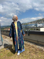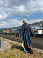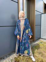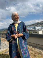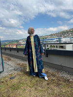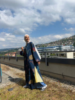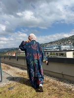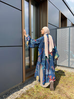 Kimono: A long, flowing kimono with a deep navy blue background adorned with colorful, intricate patterns. The designs feature a variety of marine life, including fish, starfish, and seashells, in shades of green, pink, and gold, creating an oceanic theme.