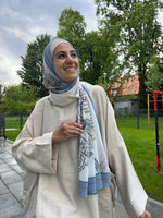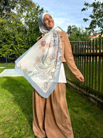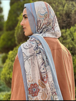 The Dilara Scarf is a vibrant and colorful accessory made from high-quality chiffon. This scarf features an intricate floral pattern in a blend of blue, beige, brown, and off-white, adding a touch of elegance to any outfit.