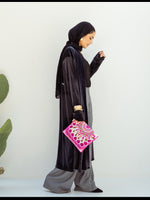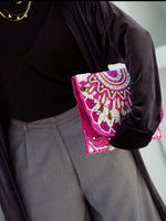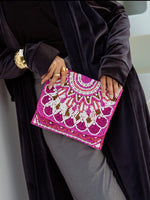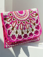 This is a vibrant clutch bag featuring intricate beadwork in fuchsia and white, complemented by elegant details.