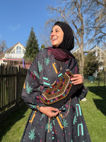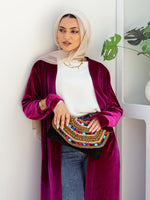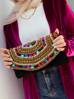 A beautifully embroidered bag adorned with vibrant, colorful rhinestones. Its intricate design sparkles with every movement, adding a touch of elegance and charm.