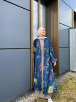 A deep navy blue kimono adorned with colorful, detailed sea creature patterns. The vibrant marine life designs, including fish, starfish, and seashells, bring an oceanic theme to this elegant piece. Ideal for cultural events, evening outings, or any occasion where you want to make a sophisticated statement.